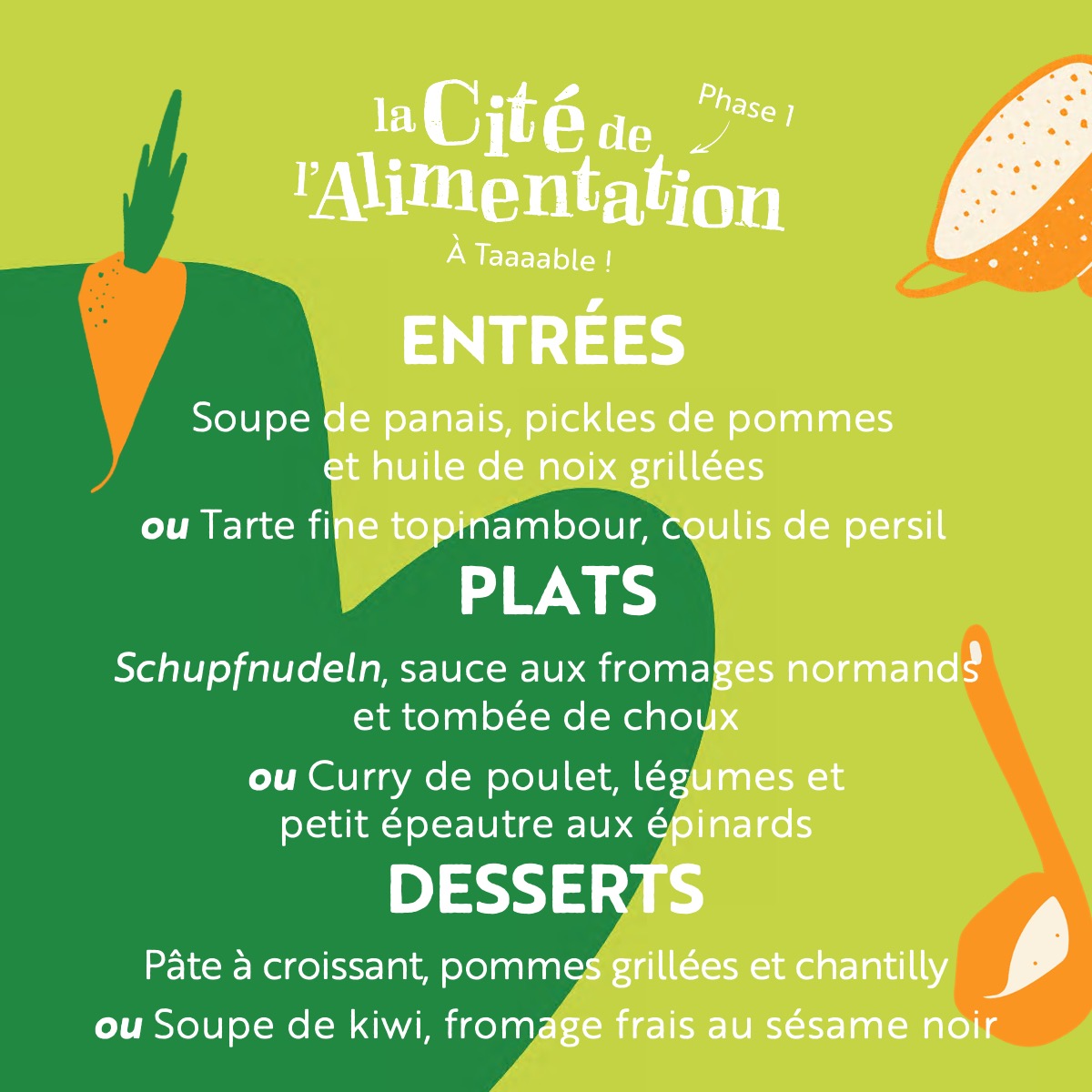 Le restaurant de la Cité de l’Alimentation est ouvert le midi, du mardi au vendredi. La carte change chaque semaine. Chaque jour vous avez le choix entre la carte «classique» et une formule « street food ». La vente à emporter est possible tous les jours quelque soit le menu.